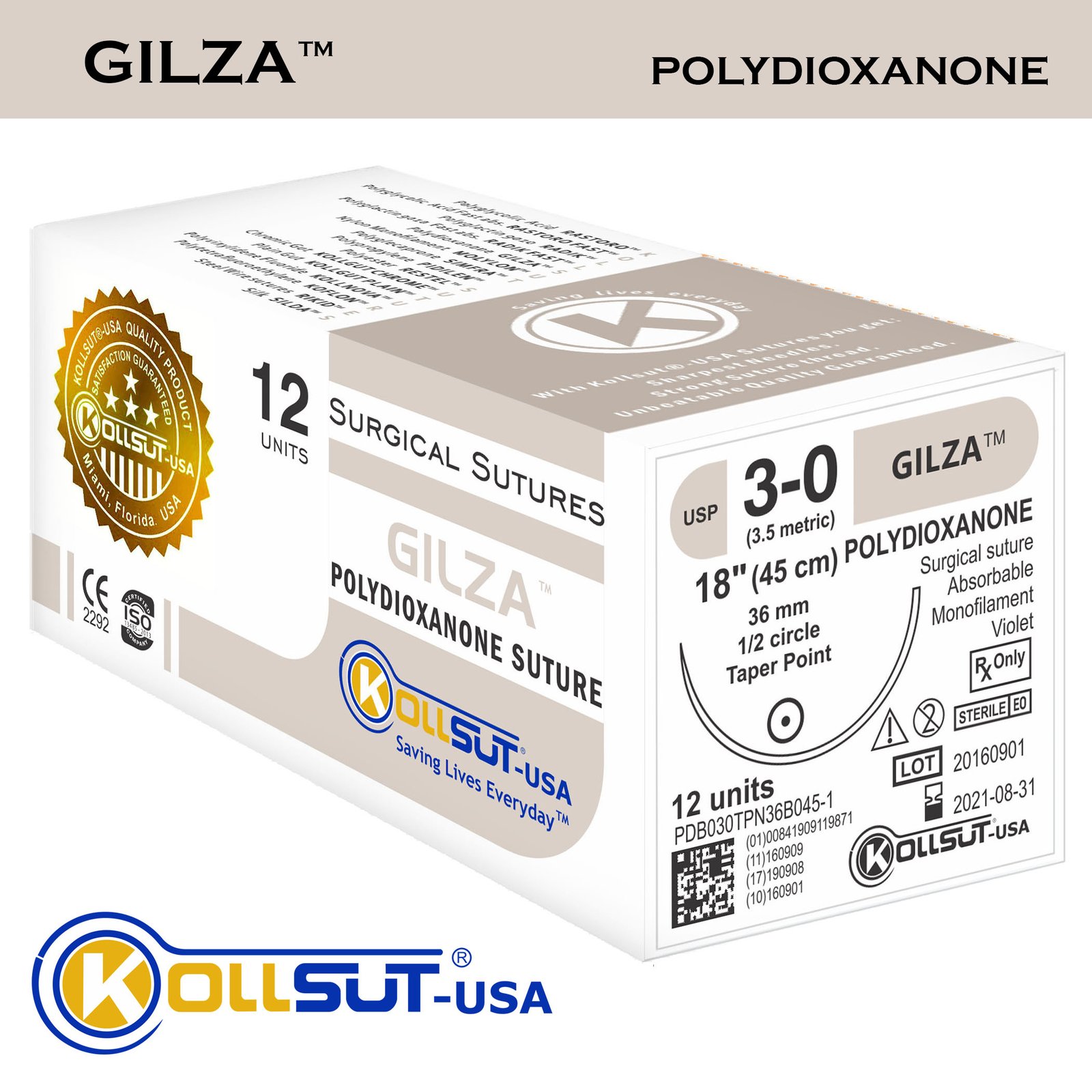 Gilza™ Sutures (Polyglycolic Acid Sutures) Description: GILZA™ (Polydioxanone-PDO) is a synthetic absorbable monofilament surgical suture material prepared from polyester poly (dioxanone). Type of thread: Monofilament Reabsorption time: Reliable absorbability by hydrolysis. Predictable absorption (loss of mass) and high in vivo strength retention. USP3/0 (EP Metric 2.0) and larger size Average 75% of the original tensile strength at 2 weeks. Average 70% of the original tensile strength at 4 weeks. Average 50% of the original tensile strength at 6 weeks. USP4/0 (EP Metric 1.5) and smaller size Average 60% of the original tensile strength at 2 weeks. Average 50% of the original tensile strength at 4 weeks. Average 50% of the original tensile strength at 6 weeks. Predictable absorption (loss of mass) in 180 to 220 days. Benefits of the Suture: Easy passage through tissue Thread color: GILZA™ sutures are available in dyed (violet) and undyed form. Available thread sizes: USP 8/0 to 4 / Metric 0.4 to 6 Available length: From 150, 120, 100, 90, 80, 75, 70, 60, 50, 45 and 30 cm, with one or two or without needle, from one thread to 10 threads above. Type of final presentation: The envelopes containing the sutures are packaged in a duly identified and protected with a cardboard box laminating plastic thermocontractable. The quantity can be: 12, 24 or 36 envelopes in each box. Color of identification: Gilza™ Sutures are identified by the Grey color (Warm Grey 3C) in the label pack.