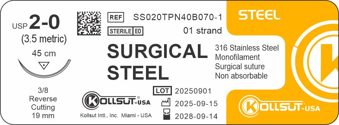 Rikid™ Sutures (Stainless Steel) Description: Rikid™ Sutures (Stainless Steel) is a non-absorbable monofilament surgical suture prepared of stainless steel wire 316LVM. Type of thread: Monofilament Reabsorption time: No absorbable Benefits of the Suture: Easy passage through tissue. Stability and reliability Thread color: Undyed Available thread sizes: USP 7/0 to 2 / Metric 0.5 to 5 Available length: From 150, 120, 100, 90, 80, 75, 70, 60, 50, 45 and 30 cm, with one or two or without needle, from one thread to 10 threads above. Type of final presentation: The envelopes containing the sutures are packaged in a duly identified and protected with a cardboard box laminating plastic thermocontractable. The quantity can be: 12, 24 or 36 envelopes in each box. Color of identification: Rikid™ Sutures are identified by light orange color (PANTONE 149C) color in the label pack.
